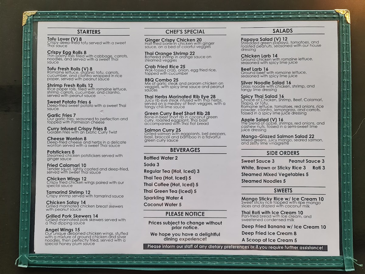 Signature dishes such as the Bangkok Flame-Grilled Chicken and Salmon Curry highlight the chef's mastery of Thai herbs and spices. The curries are a must-try, with options like the comforting Massaman and aromatic Green Curry, each rich in flavor and crafted with fresh ingredients.